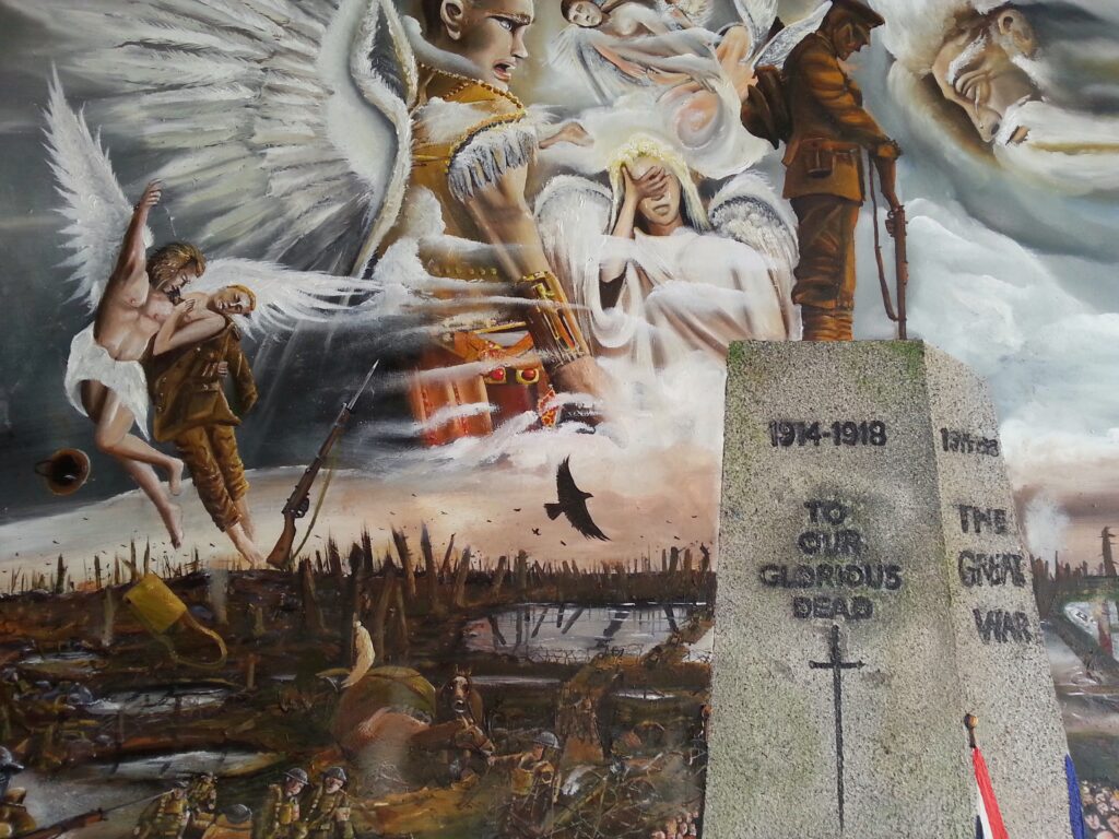 The art uses symbols. Good clashes with evil. God and Archangel Gabriel lead weeping angels. They gather dead from the field. Death watches close. Lucifer grins in joy at the pain. He craves control over human hearts. Mud and blood stain the ground. Trench life builds bonds. Kindness crosses enemy lines too. Bravery faces huge odds. The canvas lets us recall and grieve lost friends, dads, brothers. Pain echoes through time.